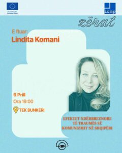Në takimin e radhës të serisë ZËRAT, e ftuar është Lindita Komani, me një bisedë mbi efektet ndërbreznore të traumës së komunizmit në Shqipëri.
