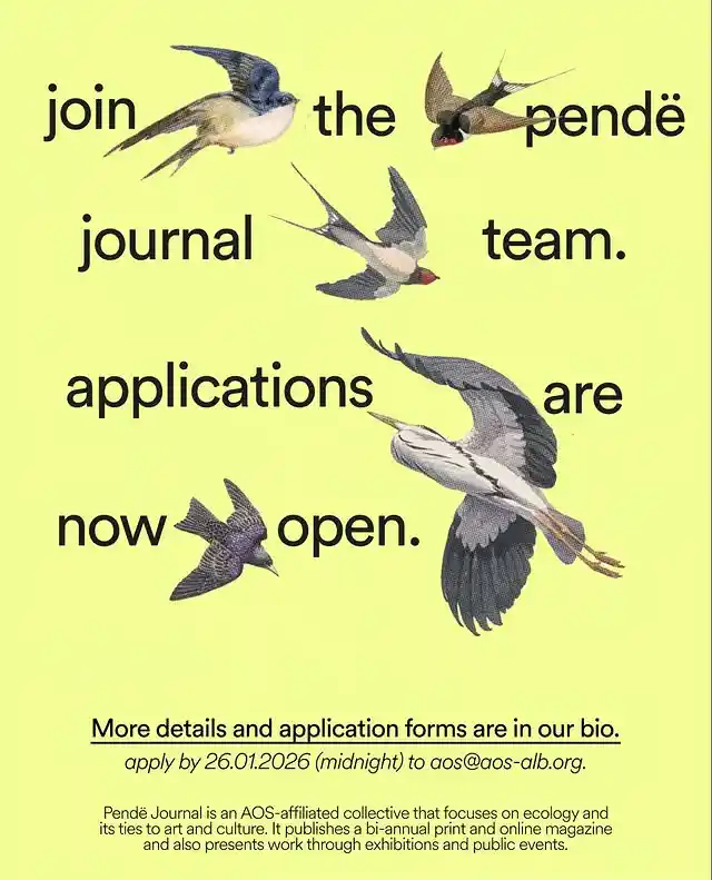 Pendë Journal is an AOS-affiliated collective that focuses on ecology and its ties to art and culture. It publishes a bi-annual print and online magazine and also presents work through exhibitions and public events. Pendë explores how ecological issues shape daily life, and how art, literature, and critical writing help us understand changing environments.