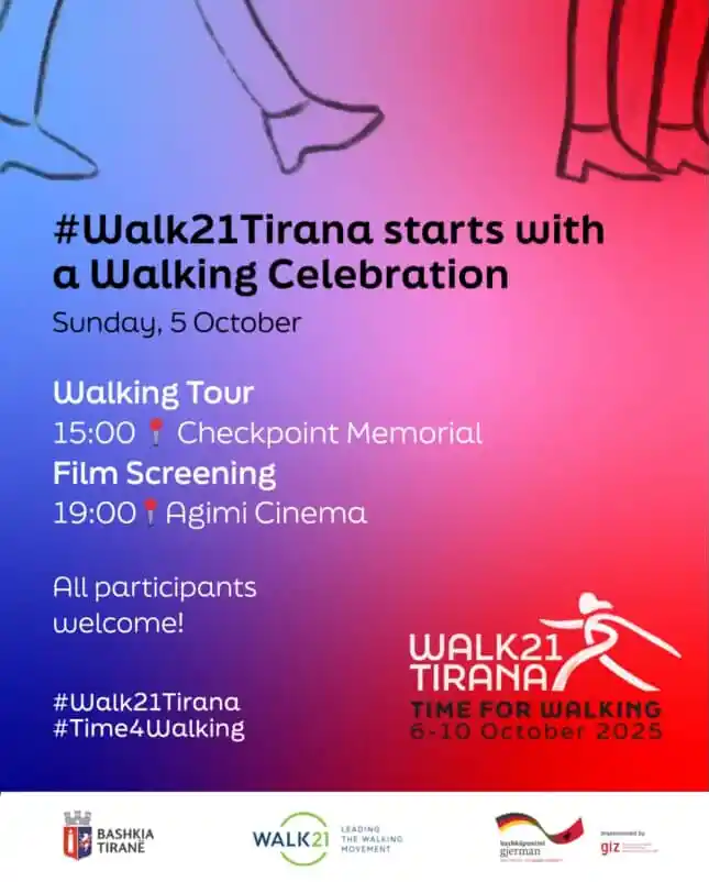 Programi i plotë: https://walk21.tirana.al/programme/?fbclid=PAZXh0bgNhZW0CMTEAAafroCmx_wk6MsYohedu_o_Yp3n_SwroQmMylAaB8JpyuUgofi3cj1_v_Iqydw_aem_BN8aoRJCXrGtufD9ya-6mw
