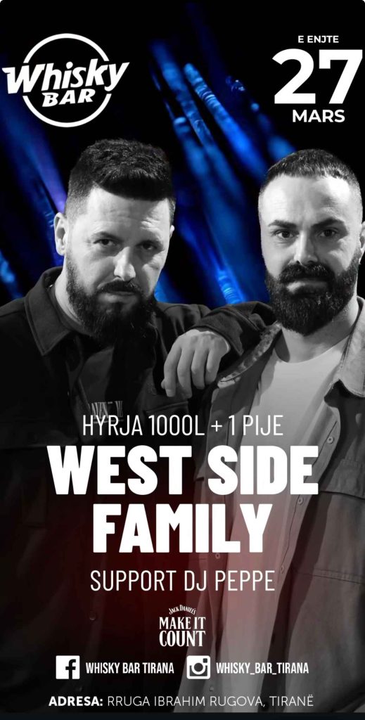 Për kënaqësinë tuaj dhe tonën 🤩 këtë të Enjte me @westsidefamilyofficial 🔥 Live në Whisky Bar !