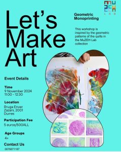 Thirrje të gjithë artistëve të rinj! 🎨✨ Frymëzuar nga modelet shumëngjyrëshe, gjeometrike në jorganët e koleksionit MuZEH Lab, kjo punëtori argëtuese dhe praktike do t’i lejojë fëmijët të eksplorojnë botën e monoprintimit në një mënyrë krijuese dhe emocionuese!