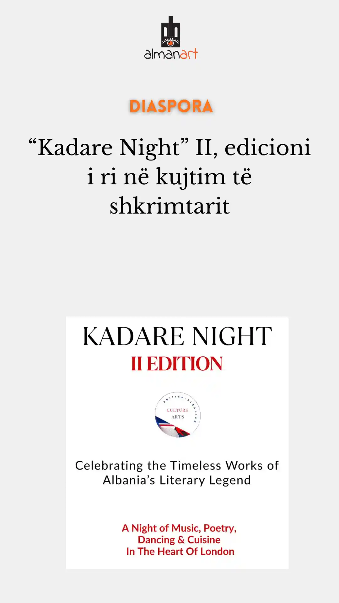 Pas suksesit të jashtëzakonshëm të festimit të saj të parë në vitin 2025, “Nata e Kadaresë” kthehet për edicionin e saj të dytë në vitin 2026, duke vazhduar një traditë vjetore që nderon trashëgiminë letrare të Ismail Kadaresë dhe shërben si një ngjarje kryesore globale për Shoqatën Britanike-Shqiptare të Kulturës dhe Arteve (BACA).