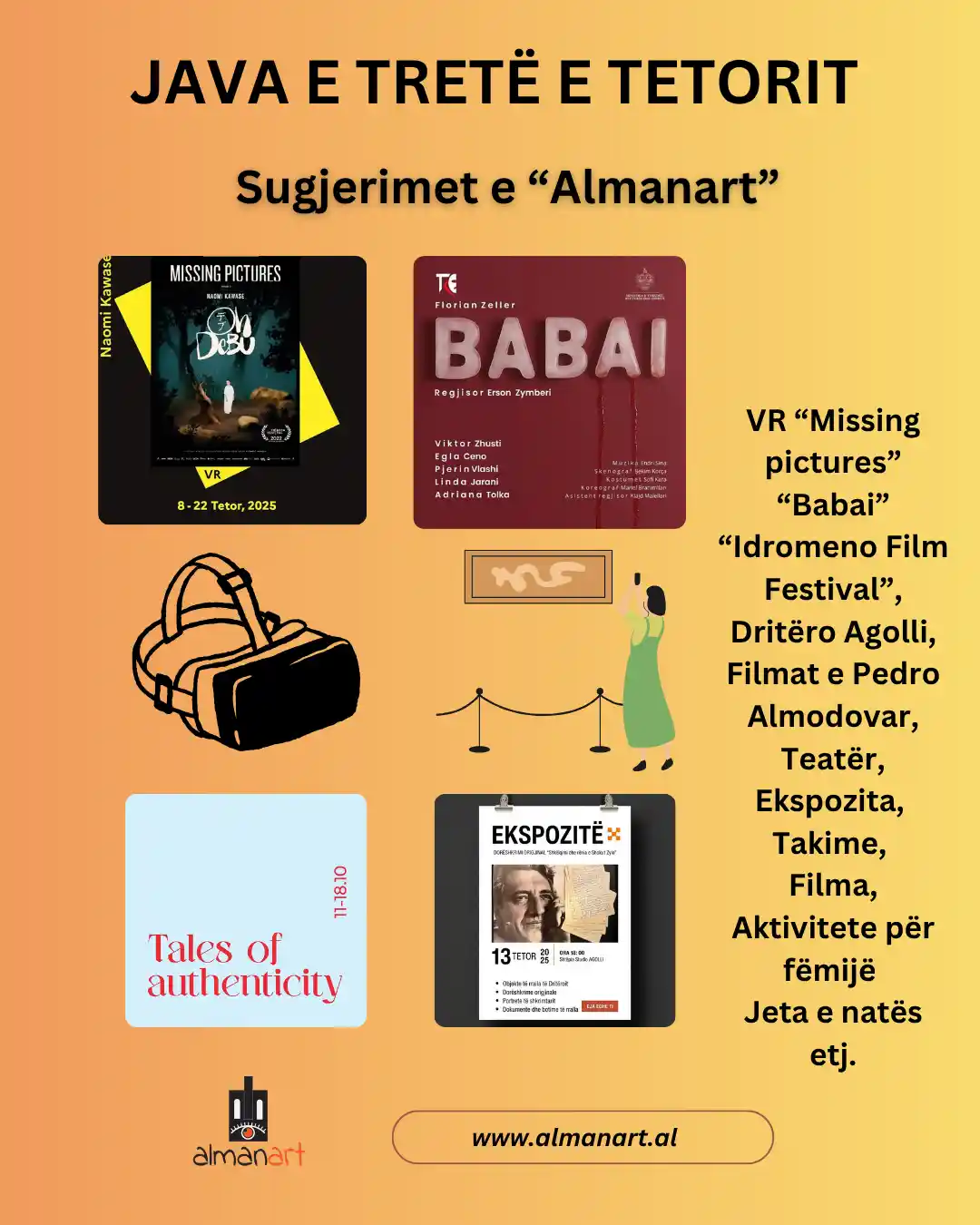 Sa i përket filmave e festivaleve të filmave, do të mbahen “Queer Film Marathon Tirana” më 29 shtator – 16 tetor 2025, me programin Filmat e Pedro Almodovar më 13-15 tetor 2025, Festivali i Filmit “Idromeno – Tales of Authencity” Shkodër më 11-18 tetor 2025, Filmat & diskutimet e javës nga “HBS Tirana” më 13, 15, 17, 19 tetor 2025, Golden Films – “Z” nga Costa Gavras më 16 tetor 2025, Filmi “Një pikë gjak” në Tiranë më 16 tetor 2025, si dhe ka nisur aplikimet për “Tirana 48 Hour Film Project”.