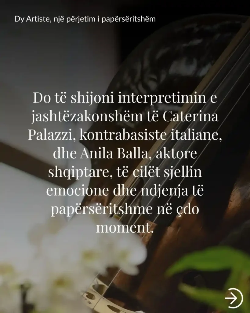 Do të shijoni interpretimin e jashtëzakonshëm të Caterina Palazzi, kontrabasiste italiane, dhe Anila Ballës, aktore shqiptare, të cilët sjellin emocione dhe ndjenja të papërsëritshme në çdo moment.