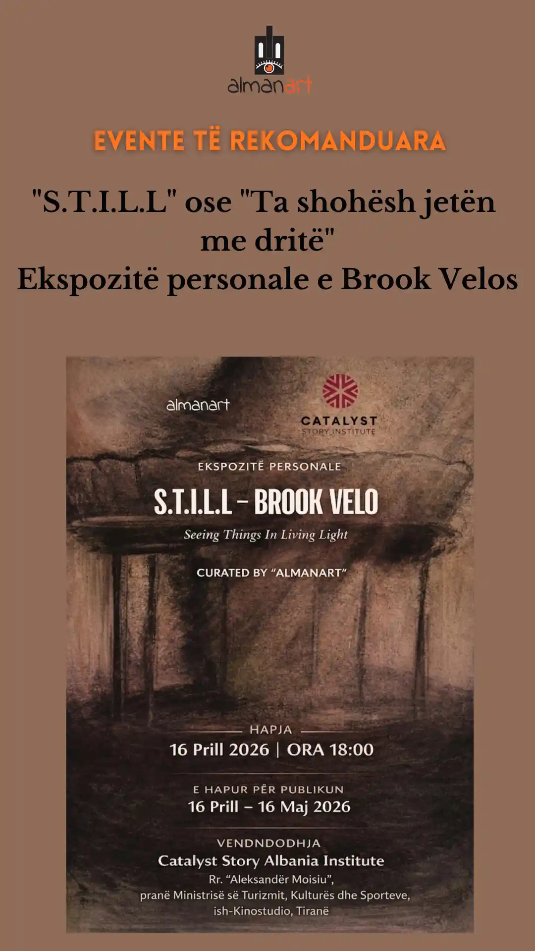 Ekspozita “S.T.I.L.L” e Brook Velos vjen si një prezantim i një serie punimesh në karbon që fokusohen te qetësia, vëmendja dhe raporti mes dritës dhe hijes. E kuruar nga “Almanart” dhe me mbështetjen e “Catalyst Story Institute Albania”, kjo ekspozitë sjell një qasje minimaliste, ku elementët vizualë theksojnë ndjesinë dhe përjetimin në bardhë e zi.